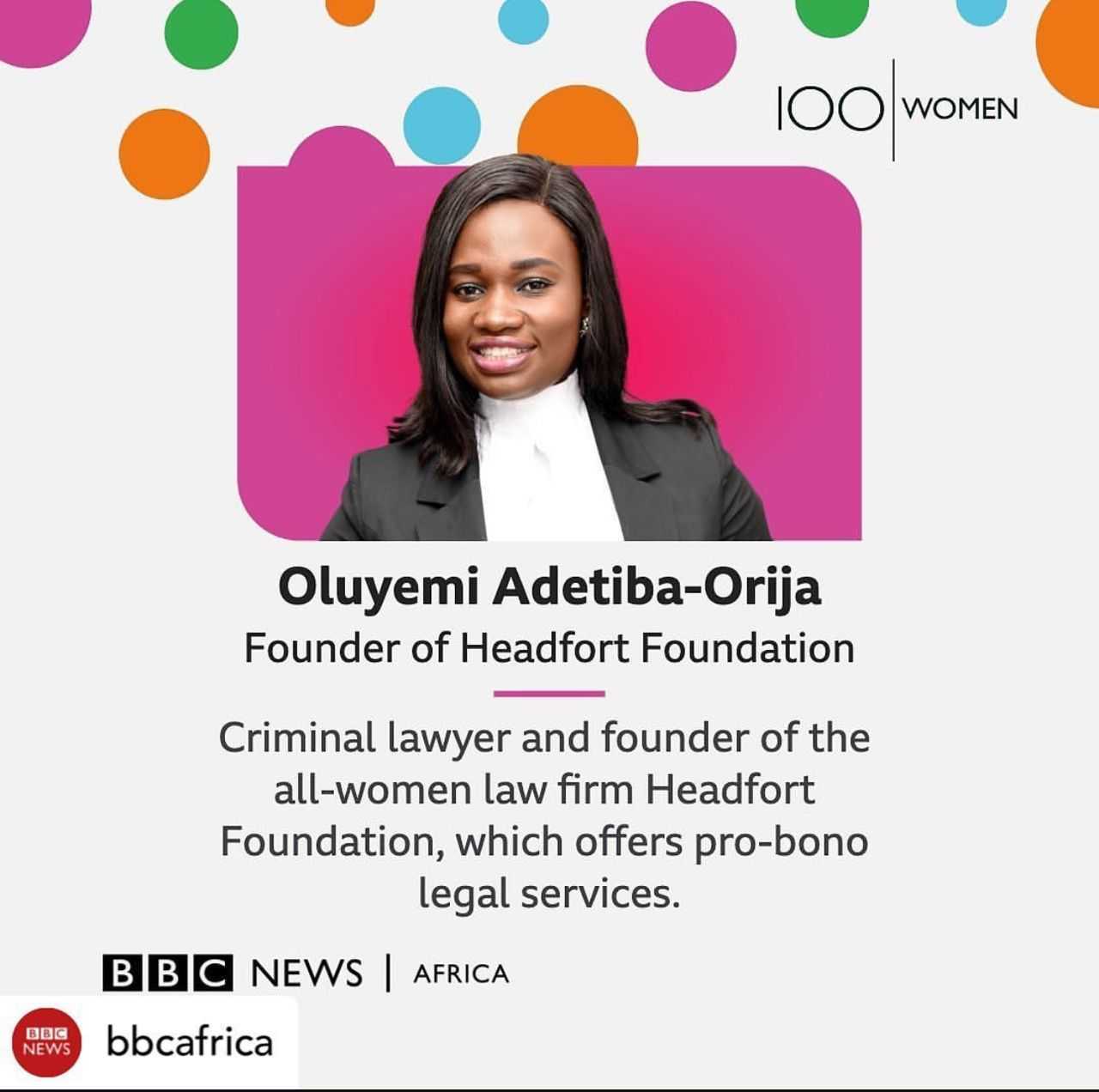 A personal childhood experience inspired Oluyemi's journey into the legal profession. When she was a child, in her village in Ekiti State, Nigeria, around 30 men were arrested and unlawfully detained for two years because they were unable to afford legal representation. She knew these men. They were her neighbors, family friends, and members of the community. As she grew up, she realized unlawful detainment was a nationwide, systemic issue, and it inspired her to become a lawyer. Shortly after passing the bar and opening her all-female law firm, she started a CSR project to offer free legal services to indigent clients in correctional facilities.