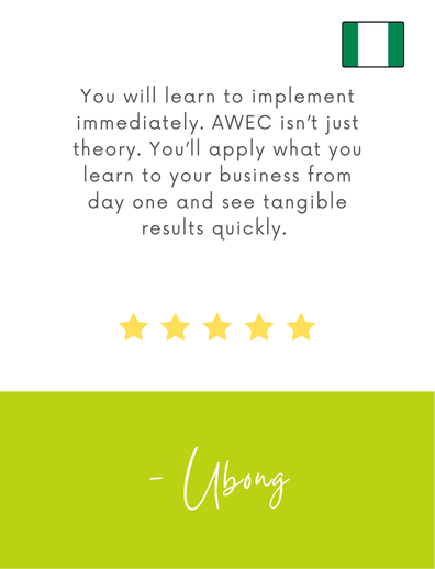 A friend from Cohort 5 told me how AWEC transformed her business. She shared how the expert training went beyond ordinary business advice and convinced me to apply. I researched AWEC and was captivated by the mission and programs. - Ubong