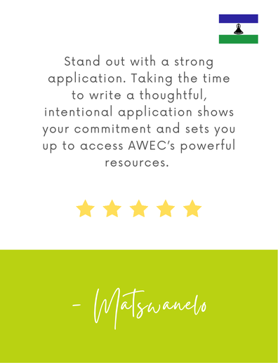 When I applied in 2022, I didn’t give the application my full attention, so I missed out. The next year, I approached my application differently. I reflected on my strengths, focused on being honest and clear about my goals, and really invested time in understanding AWEC from the website and YouTube videos, and how my business would benefit. That intentionality made all the difference and helped me get accepted. - Matswanelo